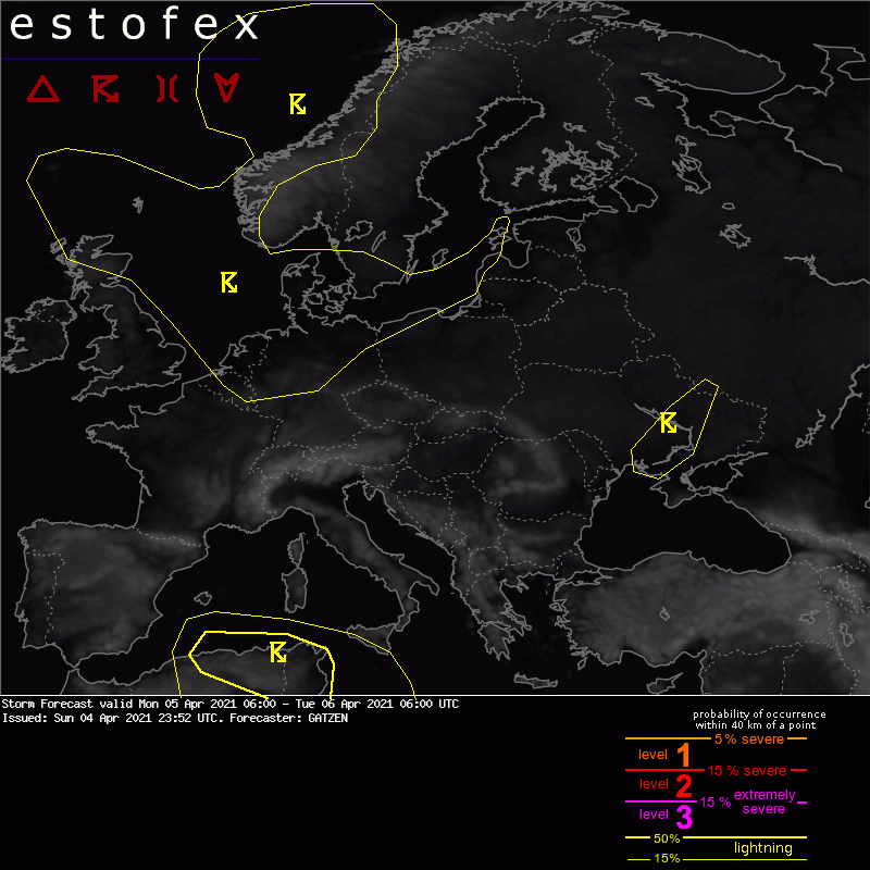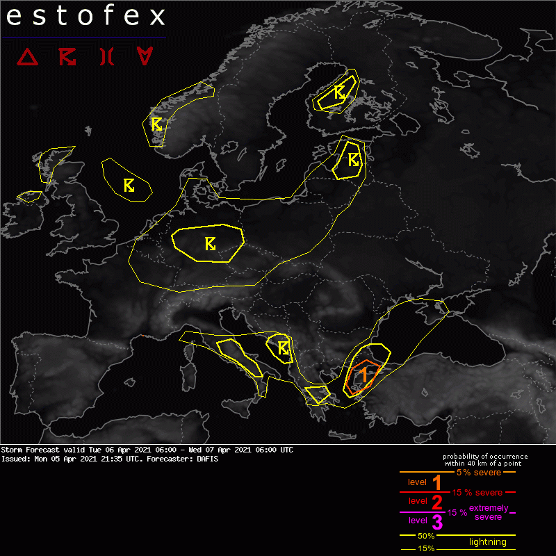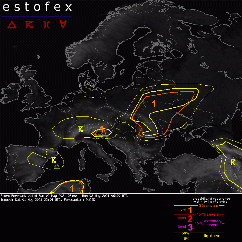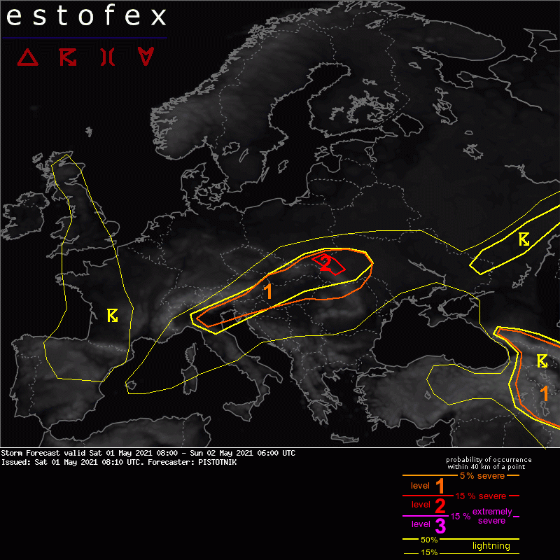 ESTOFEX products are issued to assist other meteorologists in forecasting severe weather. National meteorological services issue official warnings for your region. Those warnings can be accessed via their respective websites and on meteoalarm.eu.